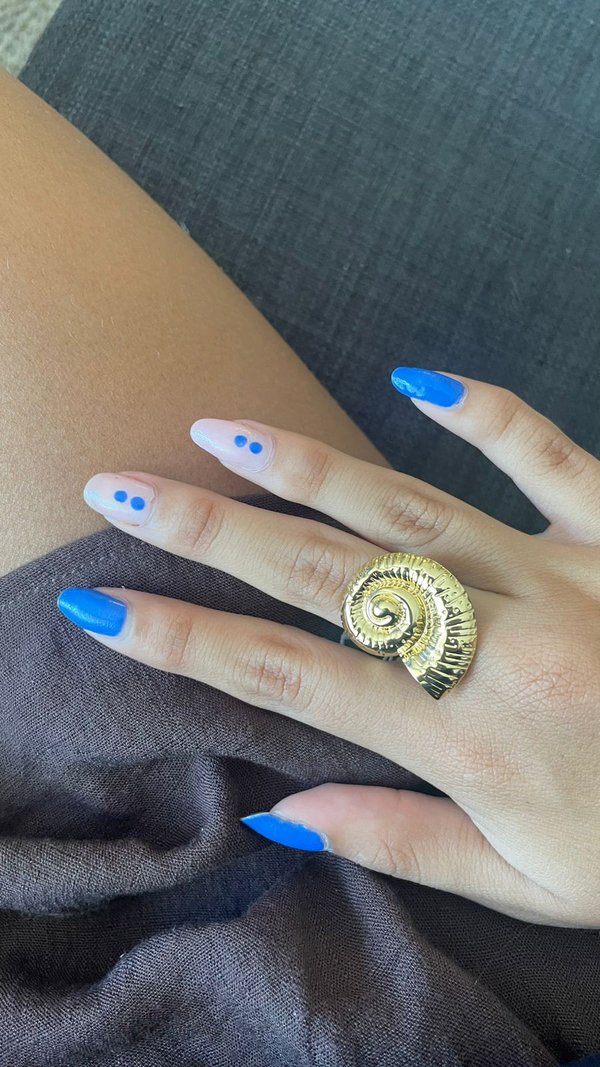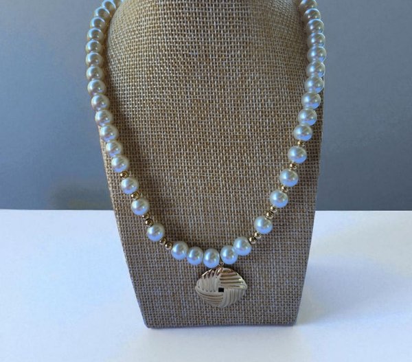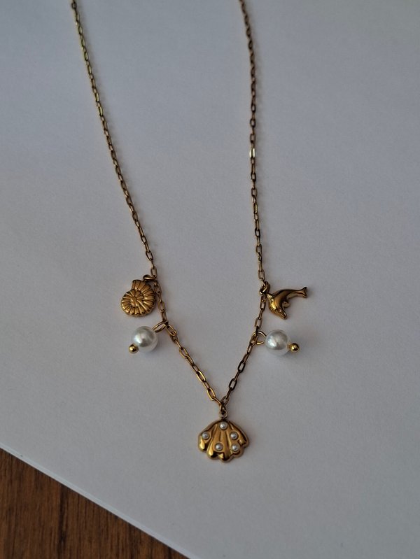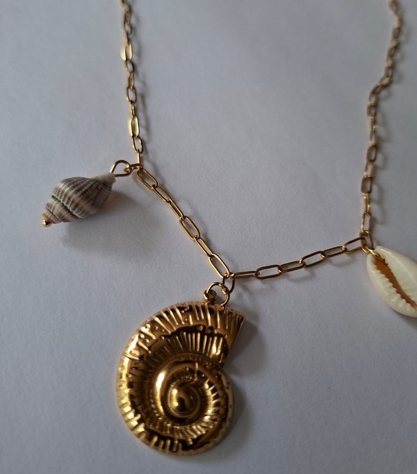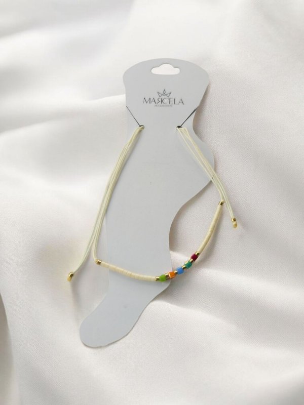 Tobillera con mostacillas y caracoles blancos y dorado. Bijouterie.