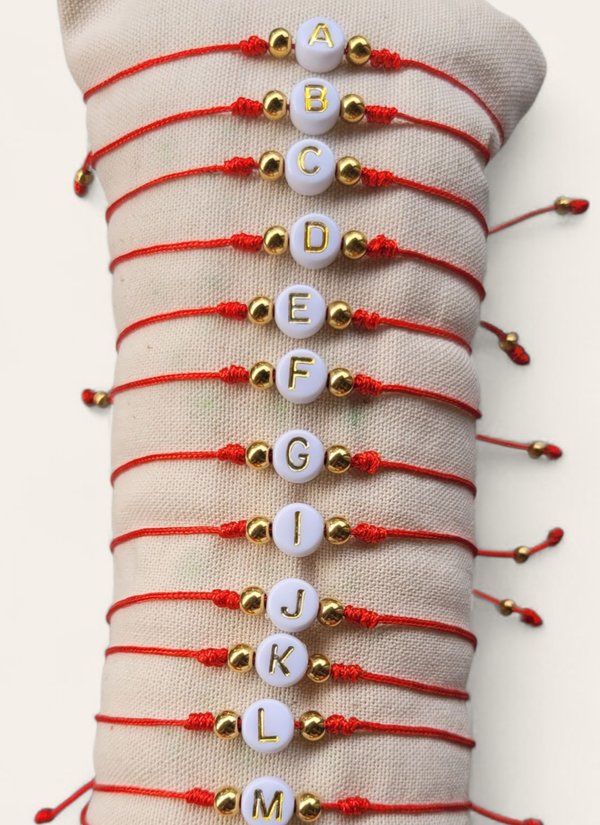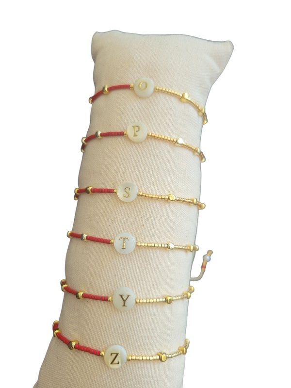 Pulsera roja y dorada con inicial. Enchapado en oro. Consultar letras disponibles.