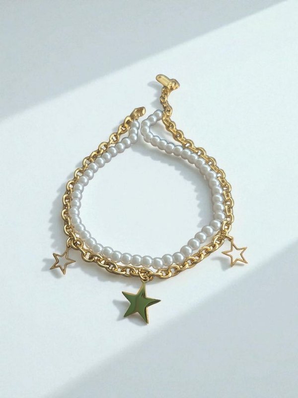 Pulsera doble con perlitas y estrellitas. Acero dorado.