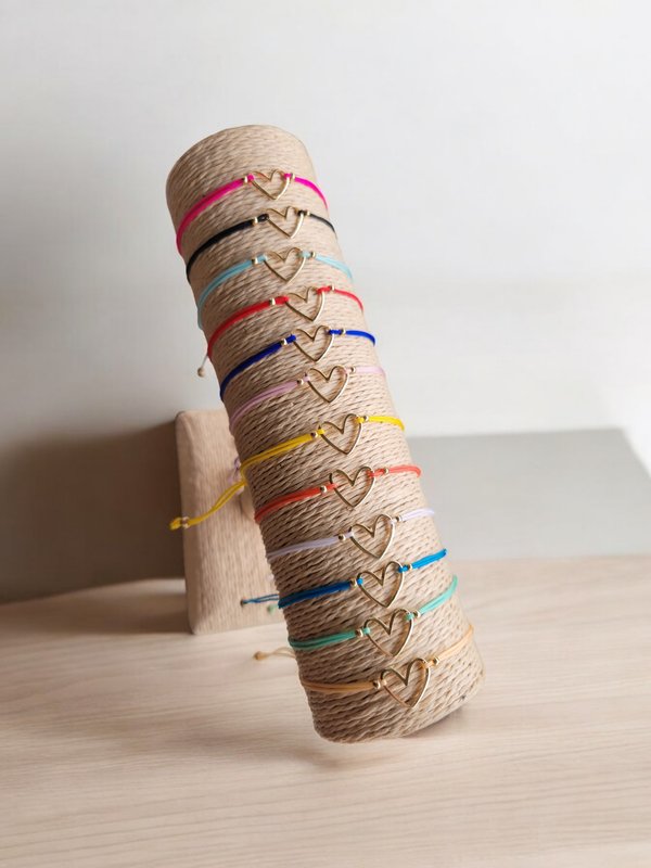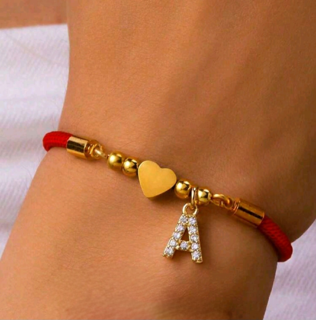Pulsera cordón rojo corazón e inicial de strass. Enchapado en oro.
