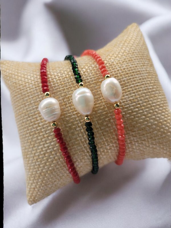 Pulsera con cristales y perla de agua dulce. Enchapado en oro.