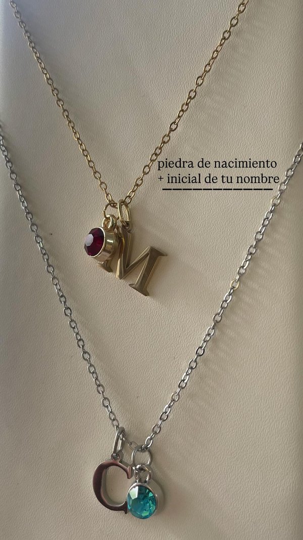 Cadena con inicial y piedra de nacimiento. Acero dorado o plateado. Consultar letras y piedras disponibles.