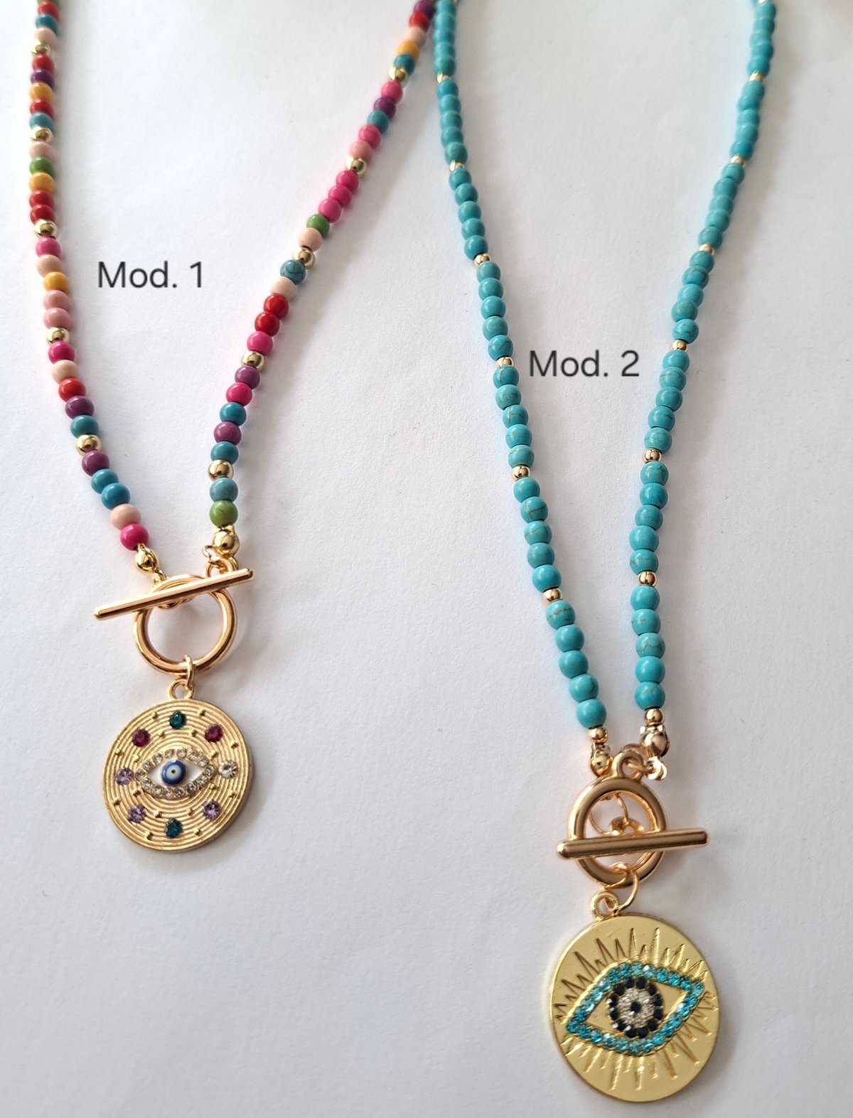 Collar colorido con cierre marinero y medalla. Bijouterie.