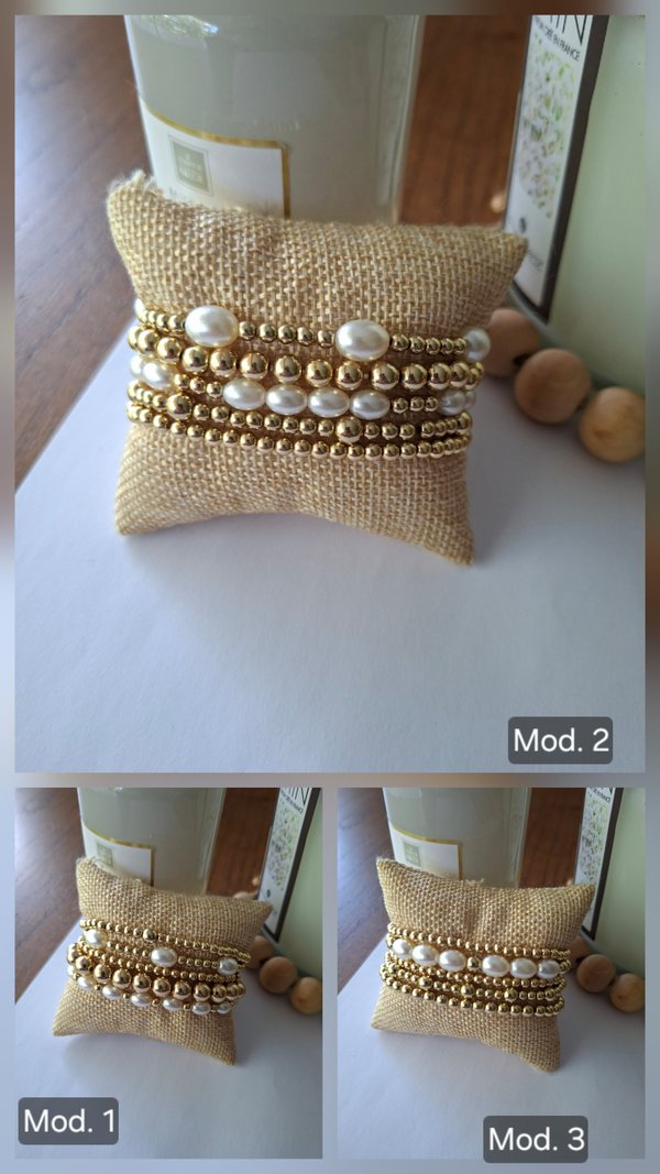 Set de 5 pulseras con pelotitas doradas y perlas. Bijouterie.