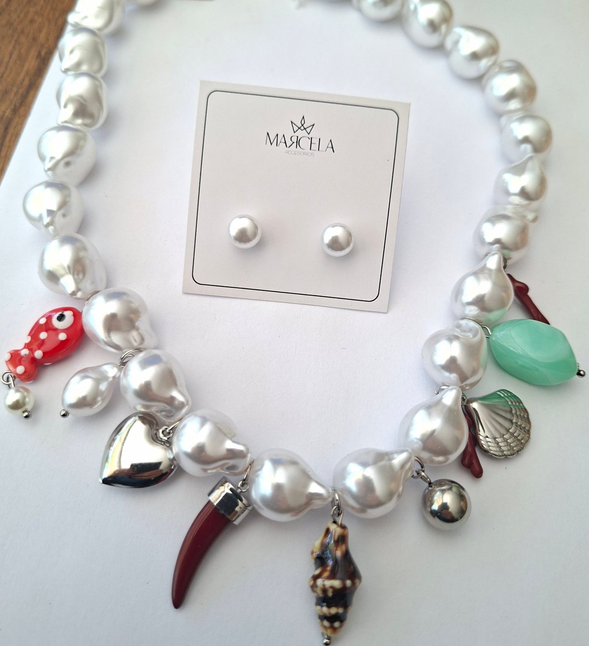 Conjunto de collar con perlas y charms. Arito de perla haciendo juego. Acero plateado.