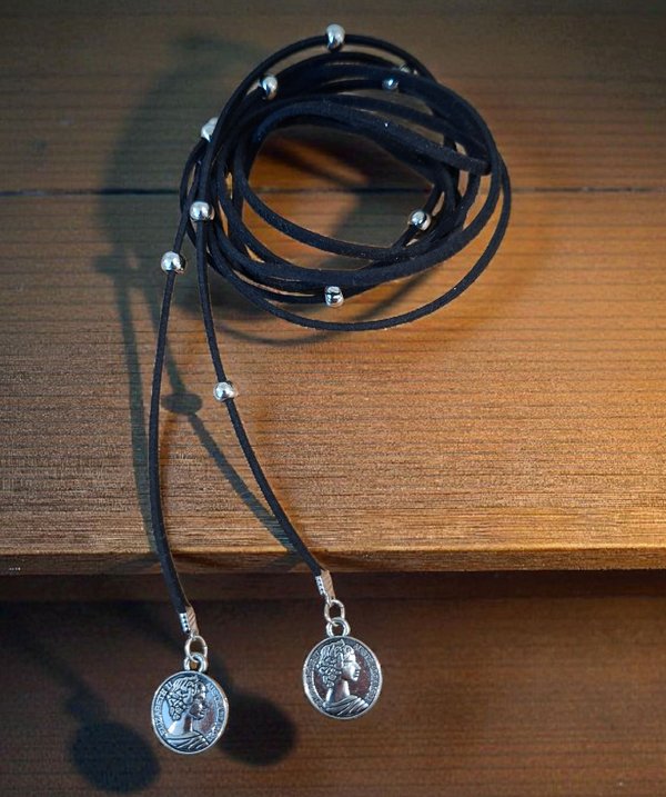 Collar cuerito con pelotitas y monedas. Bijouterie.